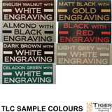 - Is manufactured from a plastic laminate in two layers, the top providing the sign colour and the bottom the text colour.