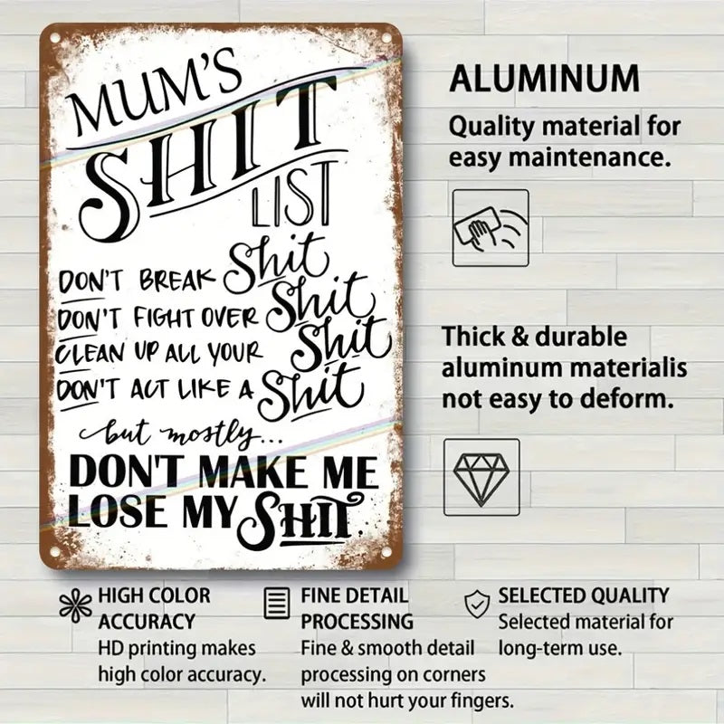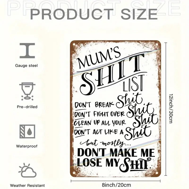 Transform your home into a haven of humor and family fun with the MUM'S SHIT LIST metal sign! Featuring a rustic vintage design and bold "house rules," it's the perfect gift for any mum who's not afraid to lay down the law. Hang it in your She-Shed for constant laughs and reminders of who's the boss!
