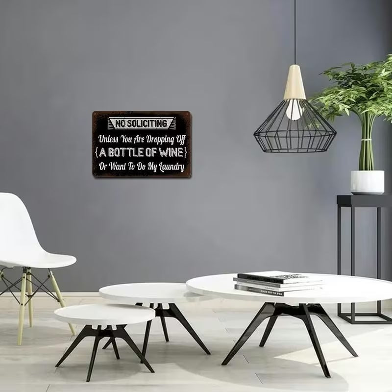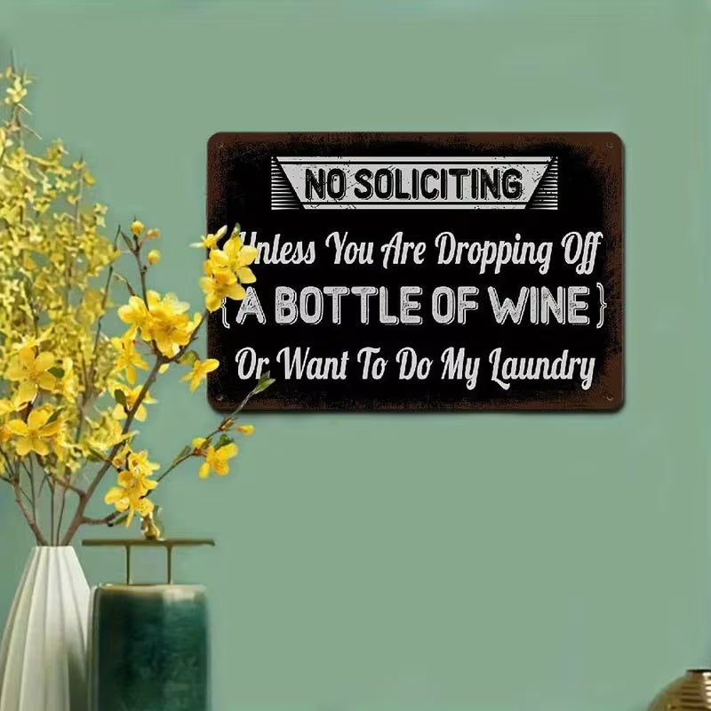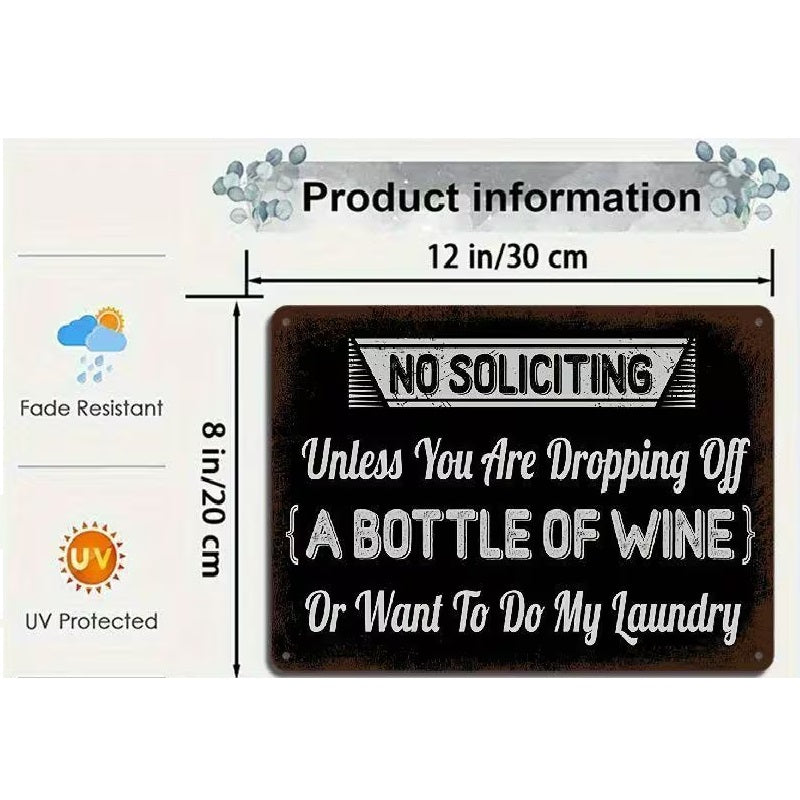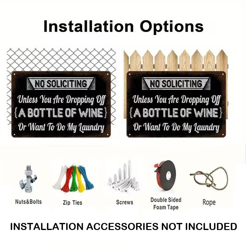 Keep unwanted visitors at bay while inviting the things you actually want with our "NO SOLICITING Unless You Are Dropping Off A BOTTLE OF WINE Or Want To Do My Laundry" UV Printed metal sign. Perfect for homeowners who value their privacy as much as their humour, this sign offers a stylish and witty way to discourage door-to-door salespeople and religious groups. Crafted from industrial-grade, rust-free aluminium and finished with high-definition UV-resistant ink, this sign is built to stand guard at your front door or gate through sun, rain, and snow without losing its vibrant finish.