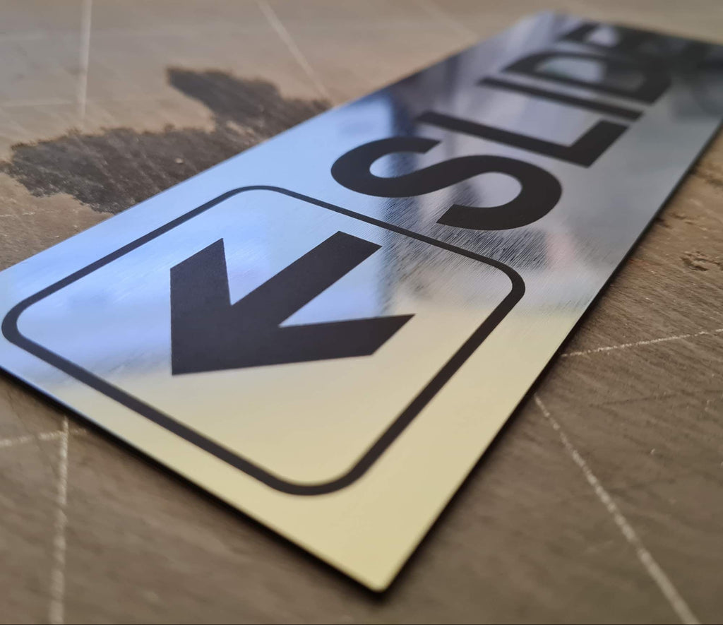 - Is manufactured from a plastic laminate in two layers, the top providing the sign colour and the bottom the text colour.