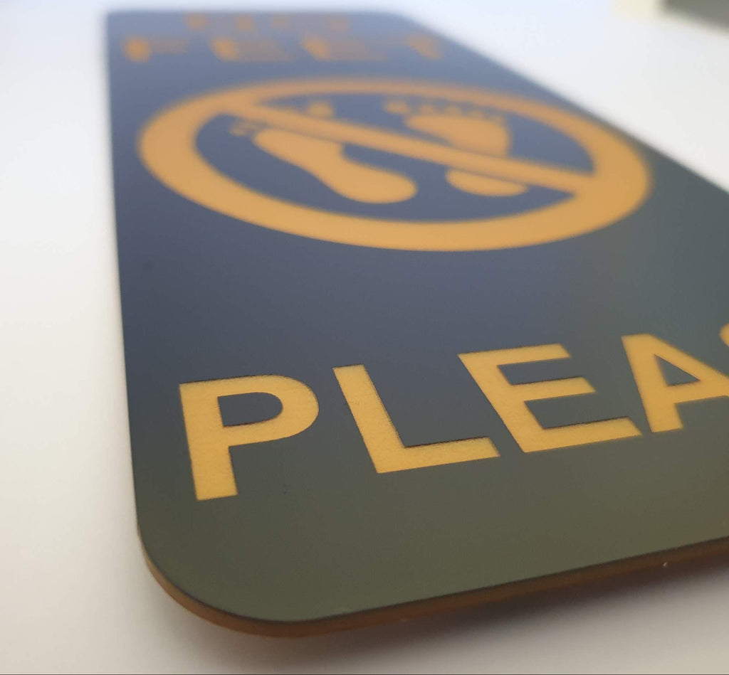 • Is manufactured from a plastic laminate in two layers, the top layer providing the sign colour and the bottom layer the text & graphic colour.