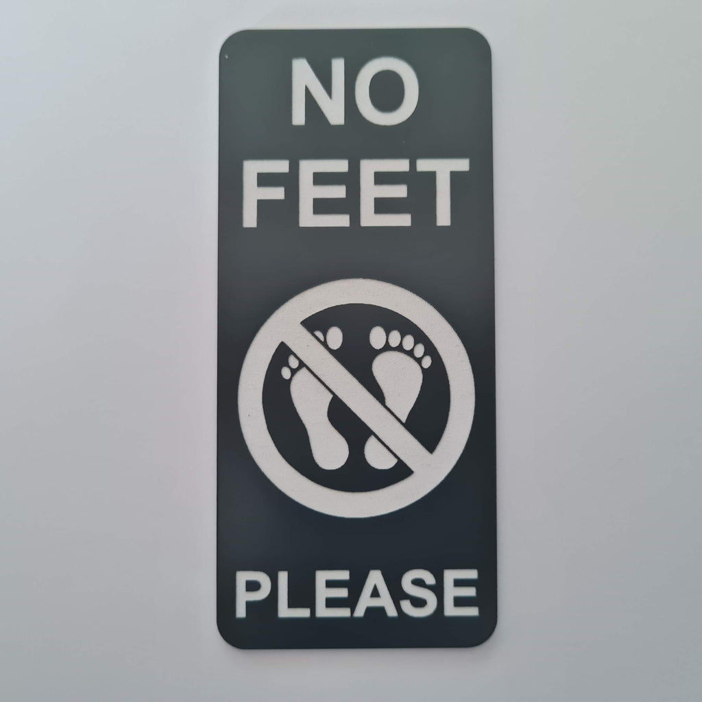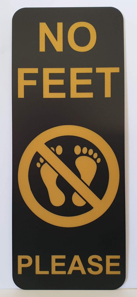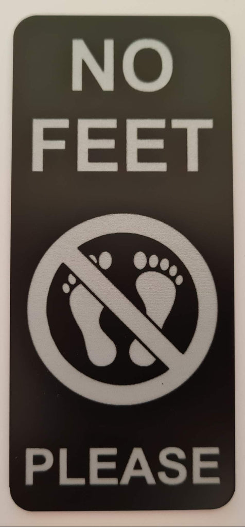 No Feet Allowed due to Cleanliness, Hygiene, Safety Sign. A sign with the text "NO FEET PLEASE" and a with a diagonal line crossing out a pair of bare feet.
